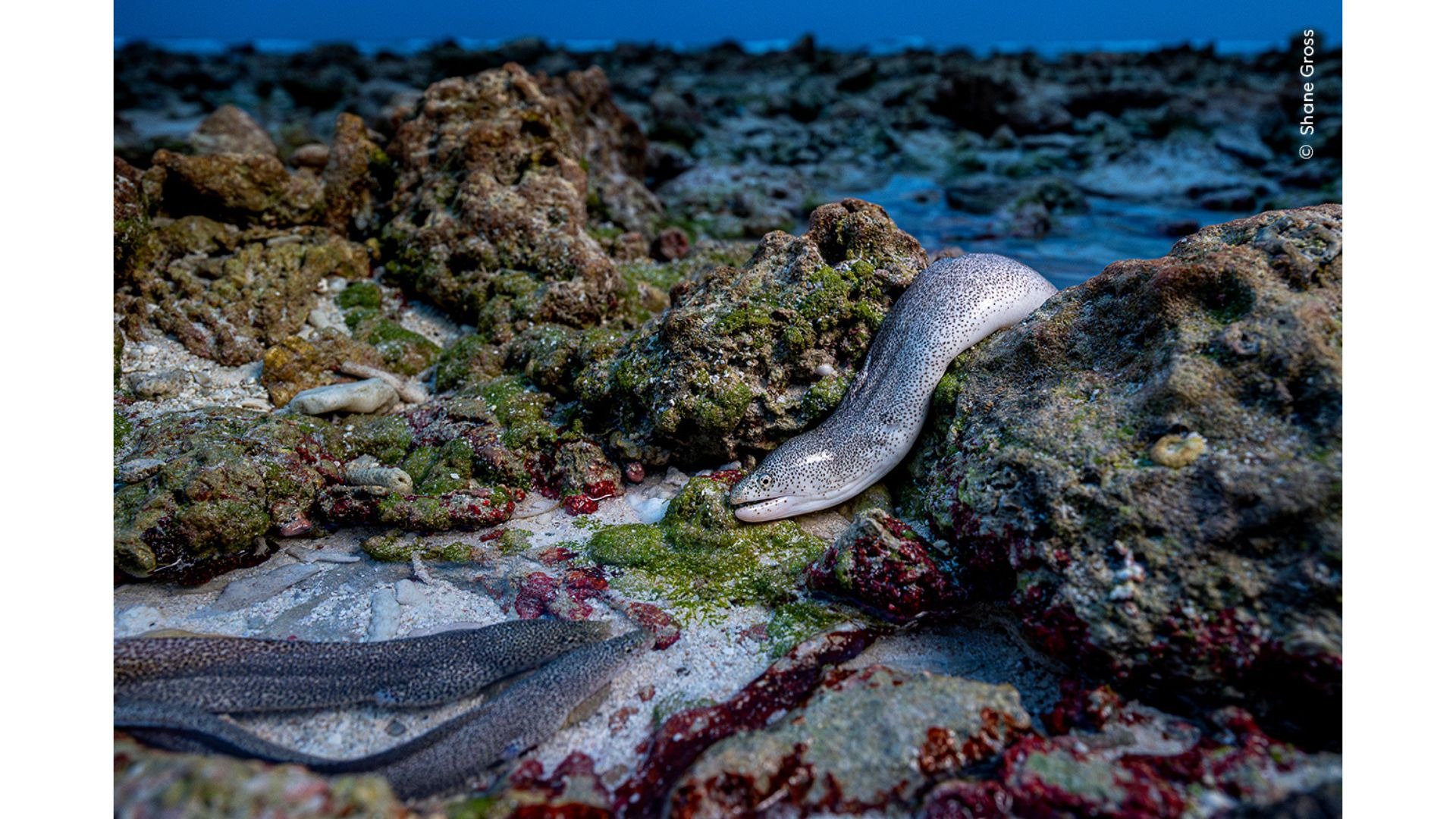 “It took Shane numerous attempts over several weeks to document this rarely photographed behaviour. At first the eels were elusive, but once Shane realised that they were scavenging for dead fish, he waited. His patience was soon rewarded when these three eels appeared.