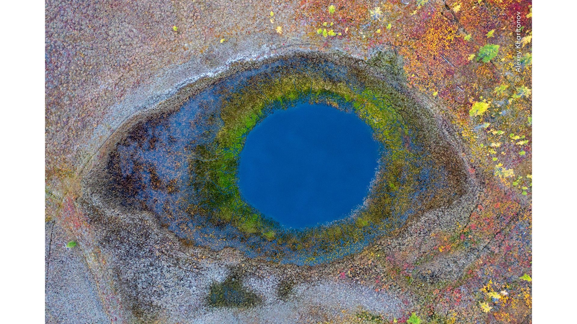In this photo, one of a series, Alexey Kharitonov depicts a thermokarst landscape where the ground sinks and forms large surface depressions. These depressions can develop into swampy bodies of water called thermokarst lakes – like this 30-metre-wide one Kharitonov discovered.