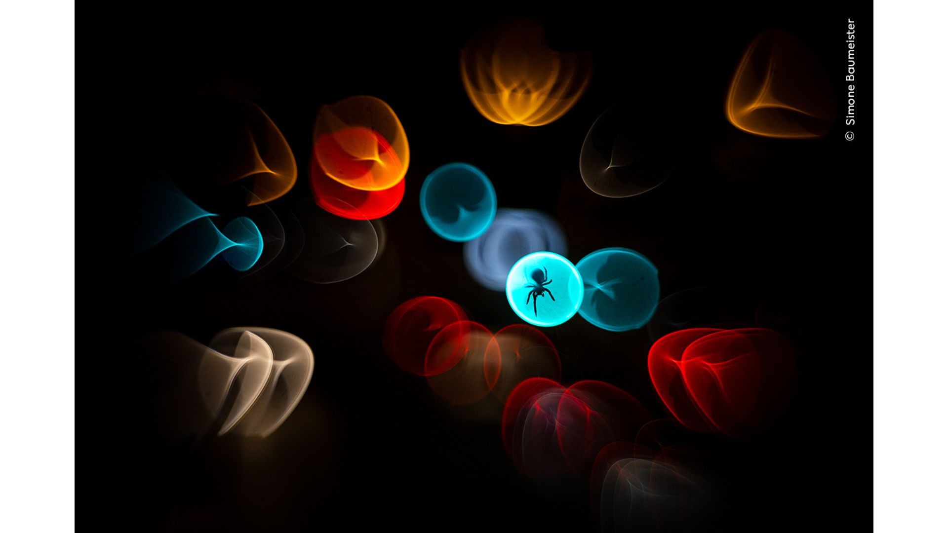 “To achieve this kaleidoscopic effect, Simone reversed one of the six glass elements in an analogue lens. This distorted the image at the edges while leaving the centre sharply focused. She then cropped the picture to move the spider slightly off-centre.
