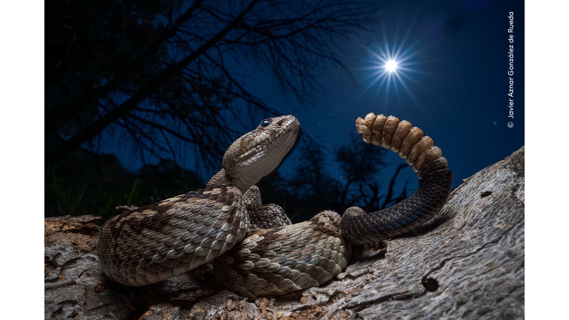 This photo, one of a series, shows a black-tailed rattlesnake spotted on the road at night outside Fort Davis, Texas. “In this instance, its tail is raised and rattling in response to the perceived threat of the snake handler who rescued it from the road,” say competition organisers.