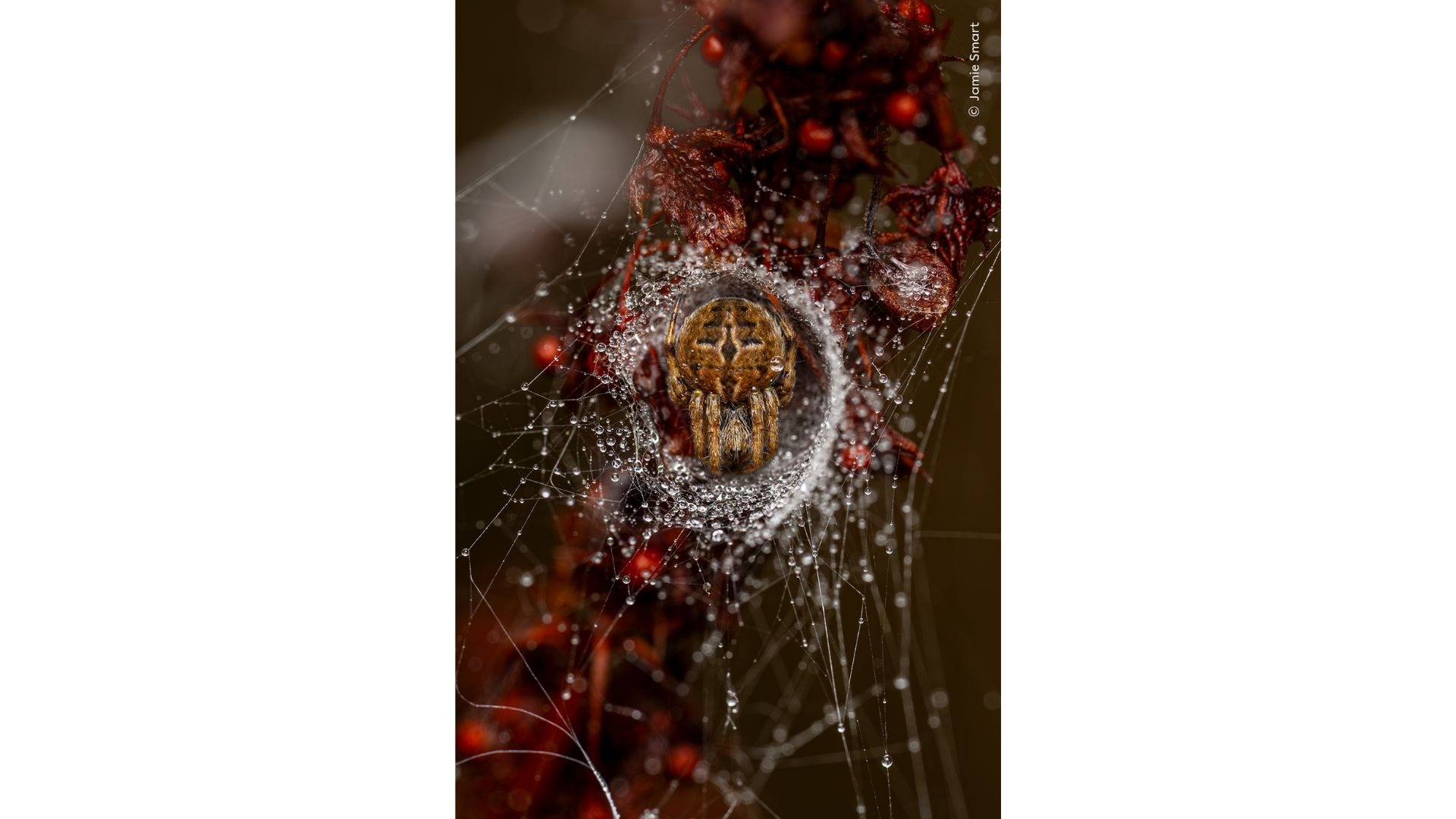 “Jamie first noticed the dew-laden web before realising its maker was sitting in a nest. With the patience and steadiness needed to manually focus her camera, she kept the spider perfectly lit and symmetrically framed.