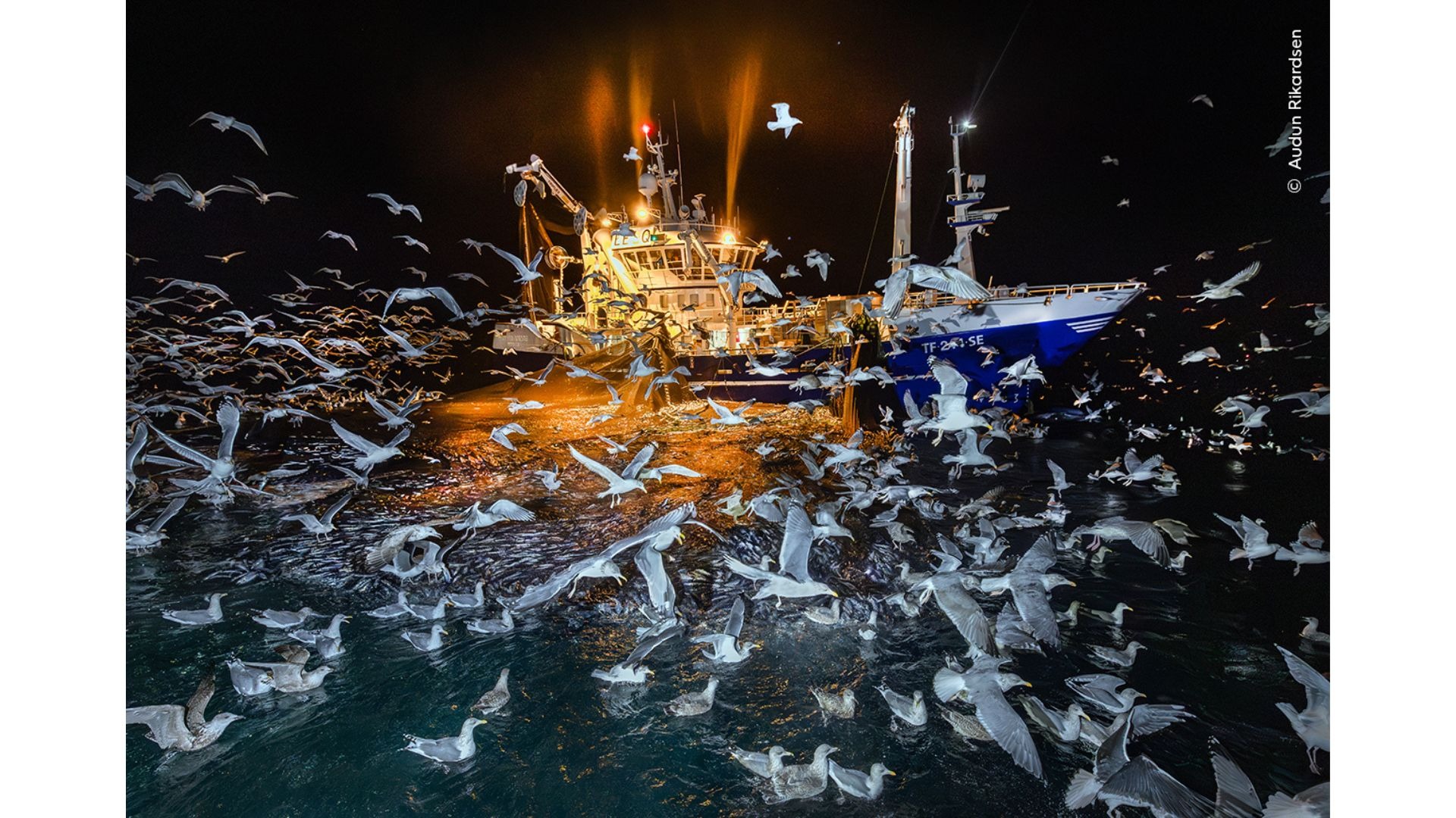“Audun managed to photograph this chaotic scene of gulls attempting to catch fish trapped by nets. The gulls have learnt to follow the sound of the boats to find a herring feast. Through his work, Audun aims to draw attention to the ongoing conflict between seabirds and the fishing industry.