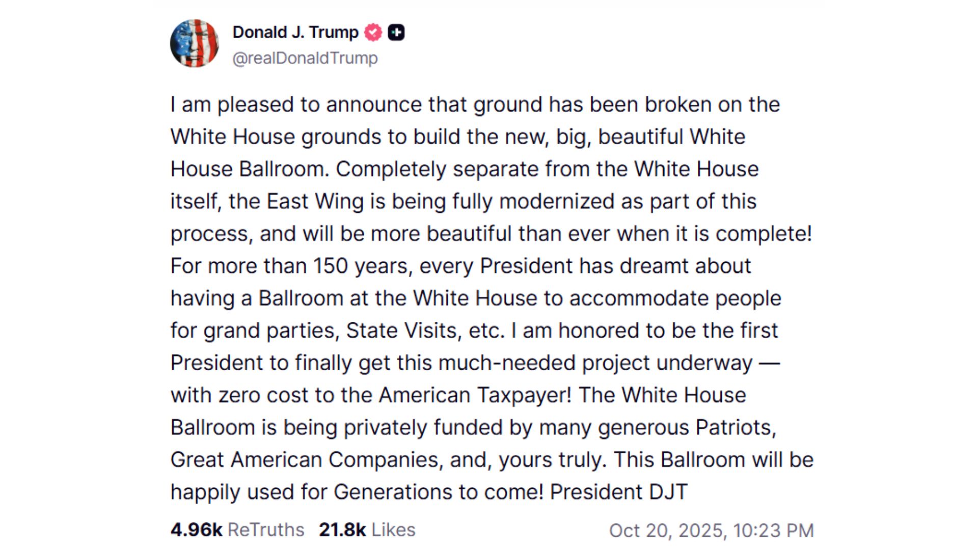 Posting on social media around the time of the project’s announcement, Trump said it would be built “with zero cost to the American Taxpayer! The White House Ballroom is being privately funded by many generous Patriots, Great American Companies, and, yours truly.”